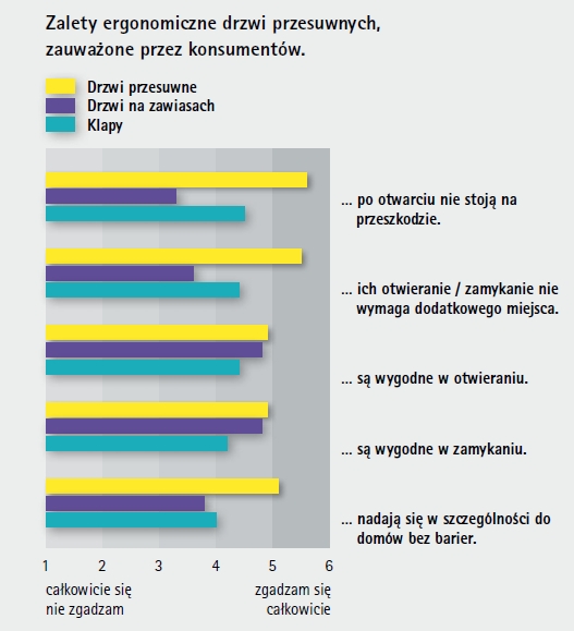 Zapytano 205 potencjalnych nabywców mebli, jak oceniają drzwi przesuwne w porównaniu z innymi systemami otwierania np. drzwiami na zawiasach czy frontami unoszonymi do góry. Okazuje się, że dla konsumentów fronty przesuwne zdecydowanie dominują wygodą użytkowania nad pozostałymi technikami otwierania, a ponadto system ten rozwiązuje wiele praktycznych problemów, z którymi możemy spotkać się na co dzień użytkując meble.